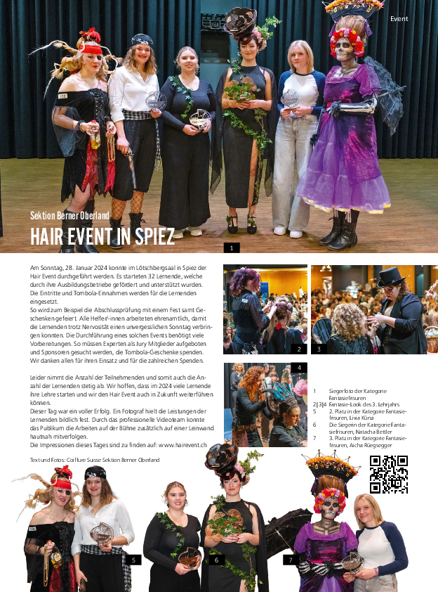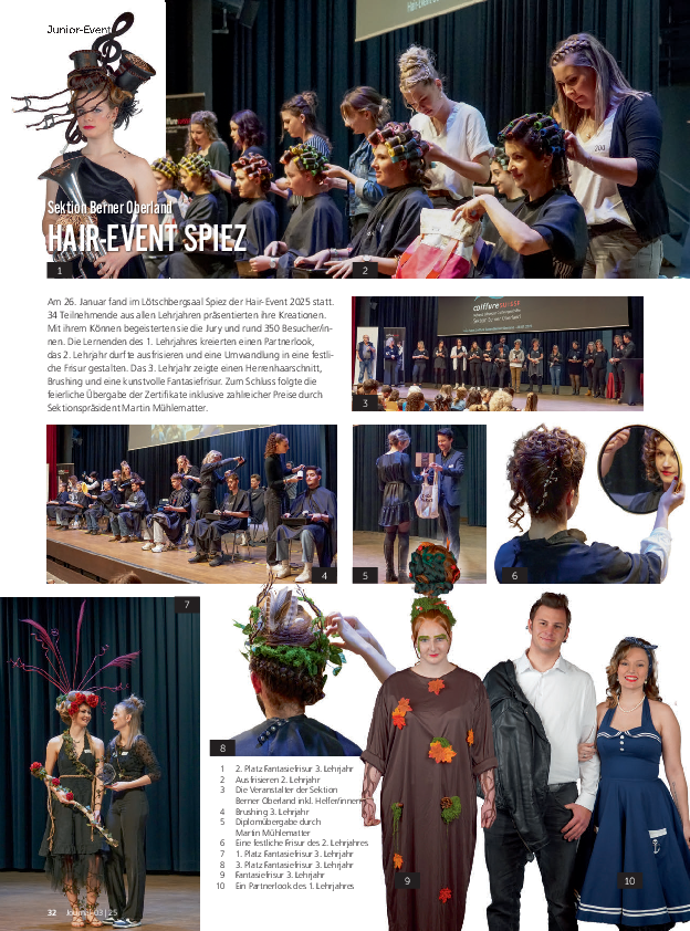 Am Sonntag, den 26. Januar 2025, boten 34 engagierte Lernende der Coiffure-Ausbildung EFZ aus dem Berner Oberland im Lötchbergsaal in Spiez ein beeindruckendes Schauspiel ihrer handwerklichen Fähigkeiten. Vor einem begeisterten Publikum zeigten die angehenden Coiffeusen/Coiffeure ihr Können und demonstrierten eindrucksvoll, wie vielseitig und kreativ die Berufsausbildung ist.